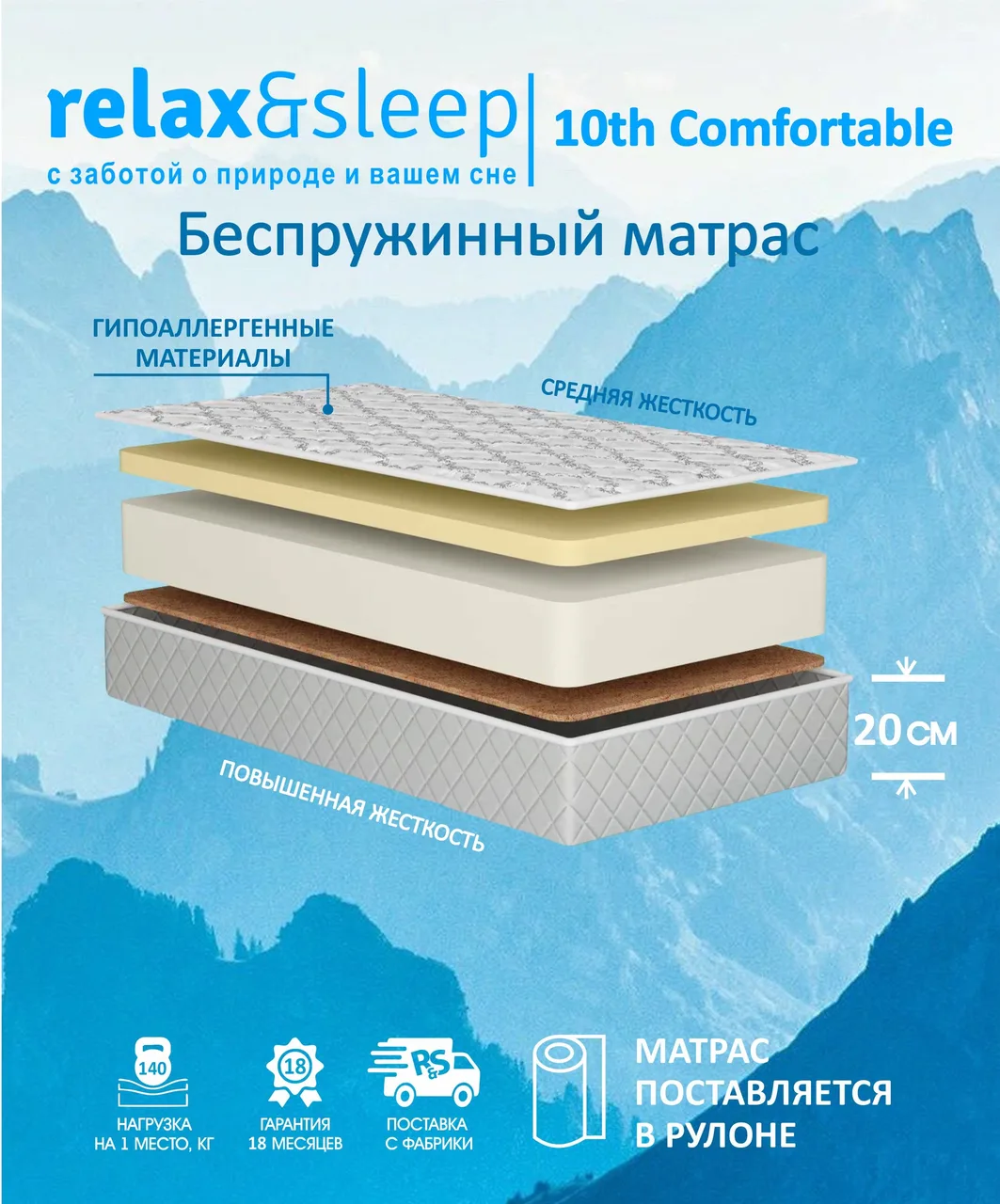 Ортопедический матрас Relax&Sleep 10th Comfortable - это удобный вариант матраса без пружин толщиной 20 см для людей весом до 140 кг.